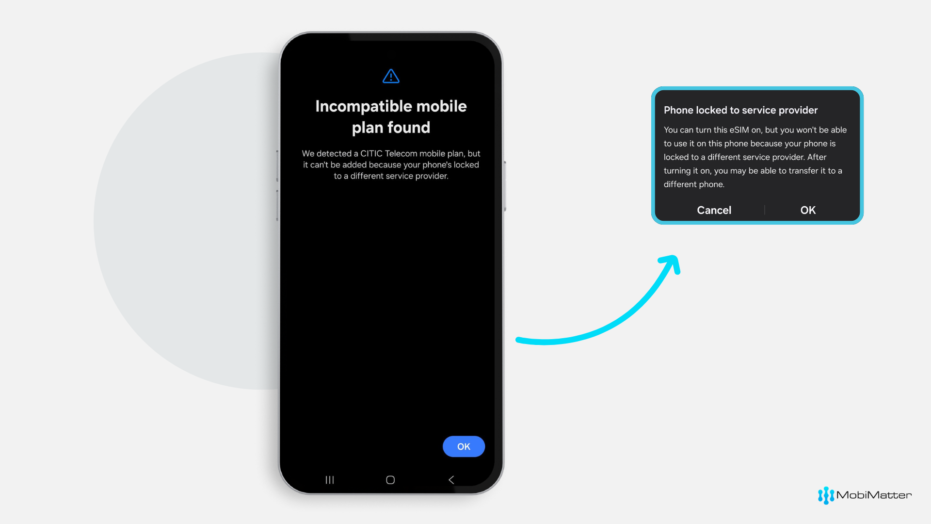 If you see the error "Incompatible mobile plan found" / "Phone locked to service provider" while installing your eSIM, your phone is most likely locked by your mobile carrier. Many smartphones sold through mobile providers are locked due to contracts or financing plans. A locked device can only use SIMs or eSIMs from the original operator.